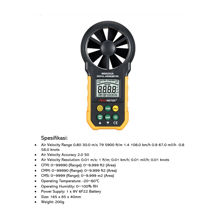 PEAKMETER model PM6252A Reading hold: Yes Work height: Maximum 2000m Work mode: Frequency of wind speed conversation Maximum show value: 9999 Sampling time: About 0.4s/time Work power: 19V 6F22 battery(Not included) Wind speed unit: m/s, km/h, mil/h, ft/m, ft/s Air volume: CMS, CMM, CFM Area unit: m2, ft2