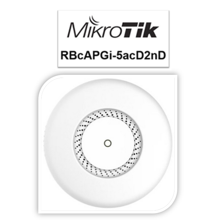 Router MIKROTIK RBcAPGi-5acD2nD cAP ac (Dual) Ceiling Mount Design Support PoE in 802.3at/at PoE Out type-B High-Gain Ceiling Antenna Spesifikasi RBcAPGi-5acD2nD Product Code RBcAPGi-5acD2nD Architecture ARM CPU IPQ-4018 716MHz Quad Core Current Monitor no Main Storage/NAND 16MB RAM 128MB SFP Ports 0 LAN Ports 2 Gigabit Yes Switch Chip 0 MiniPCI 0 Integrated Wireless 1 Wireless Standarts 802.11 a/b/g/n/ac Wireless Tx Power 26dbm Integrated Antenna Yes Antenna Gain 2 x 2.5dBi MiniPCIe 0 SIM Card Slots No USB 0 Power on USB No Memory Cards No Power Jack 0 802.3af Support Yes POE Input Yes POE Output Yes, port2 Serial Port No Voltage Monitor No Temperature Sensor No Dimentions 185 x 185 x 31mm Operating System RouterOS Temperature Range -10C to +70C RouterOS License Level4