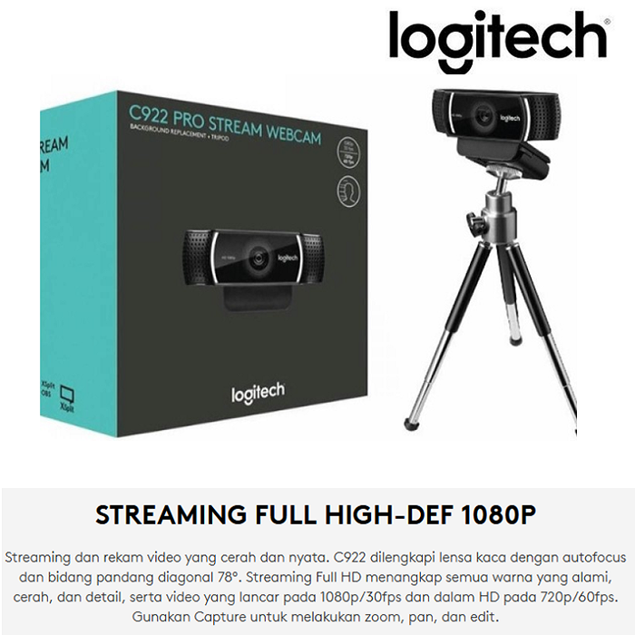 C922 PRO HD STREAM WEBCAM Webcam bagi para streamer. HD 720p yang super cepat pada 60fps Spesifikasi Teknis Resolusi Maks.: 1080p/30 fps – 720p/ 60 fps Jenis fokus: Autofocus Jenis lensa: Kaca Mikrofon internal: Stereo Bidang pandang diagonal (dFoV) 78 derajat Universal clip yang kompatibel dengan tripod ini cocok dengan berbagai laptop, LCD, atau monitor